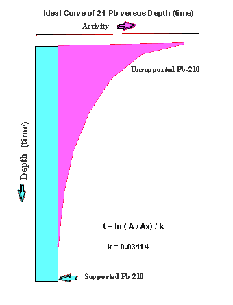 Lead-210 : 210 Pb, with a half-life of 22.8 years, is ideal for most ecosystem studies, where changes have occurred within the last century. A member of the 238U series, lead-210 is subject to disequilibria with its distant relative radium-226 (226Ra) due to the physio-chemical activity of the intermediate gaseous progenitor radon-222 (222Rn). Radioactive disequilibrium arises when the gaseous radon-222 escapes into the atmosphere. With a half-life of 3.8 days, the radon-222 decays through a series of very short half-life isotopes to lead-210. This process produces excess lead-210 in the atmosphere and subsequently the hydrosphere. Like berylium, the highly reactive lead is rapidly adsorbed to or incorporated on particulate material. Precipitation of this material produces excess lead-210 over lead-210 in equilibrium with ambient 226Ra already in sediments. This excess lead-210 provides the mechanism for age and depositional assessment. (More : Understanding Lead-210 dating)